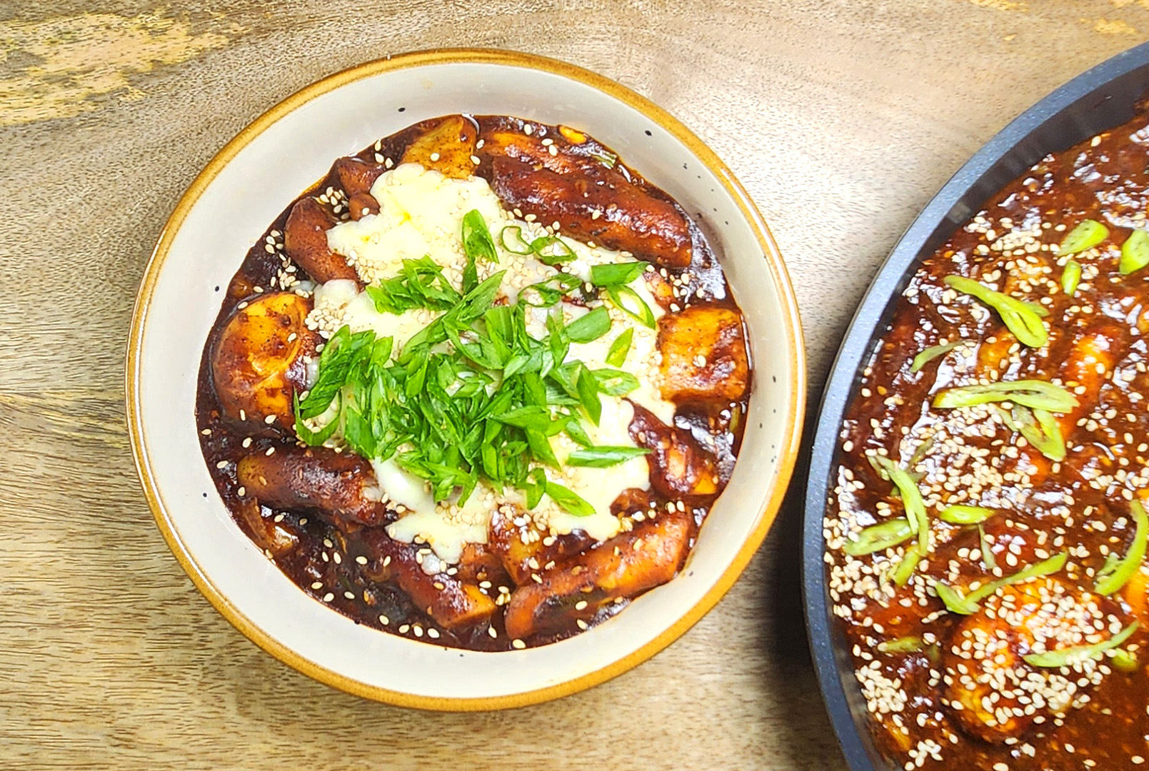 Korean rice cakes lend their signature soft chewiness to a thick and smooth, deep red gochujangy sauce. Soft boiled eggs and fish add a pop of flavour and complementary texture. Finish off with a generous heap of cheese which becomes a gooey blanket on top. Though this looks complicated, it’s actually quick and easy to make.